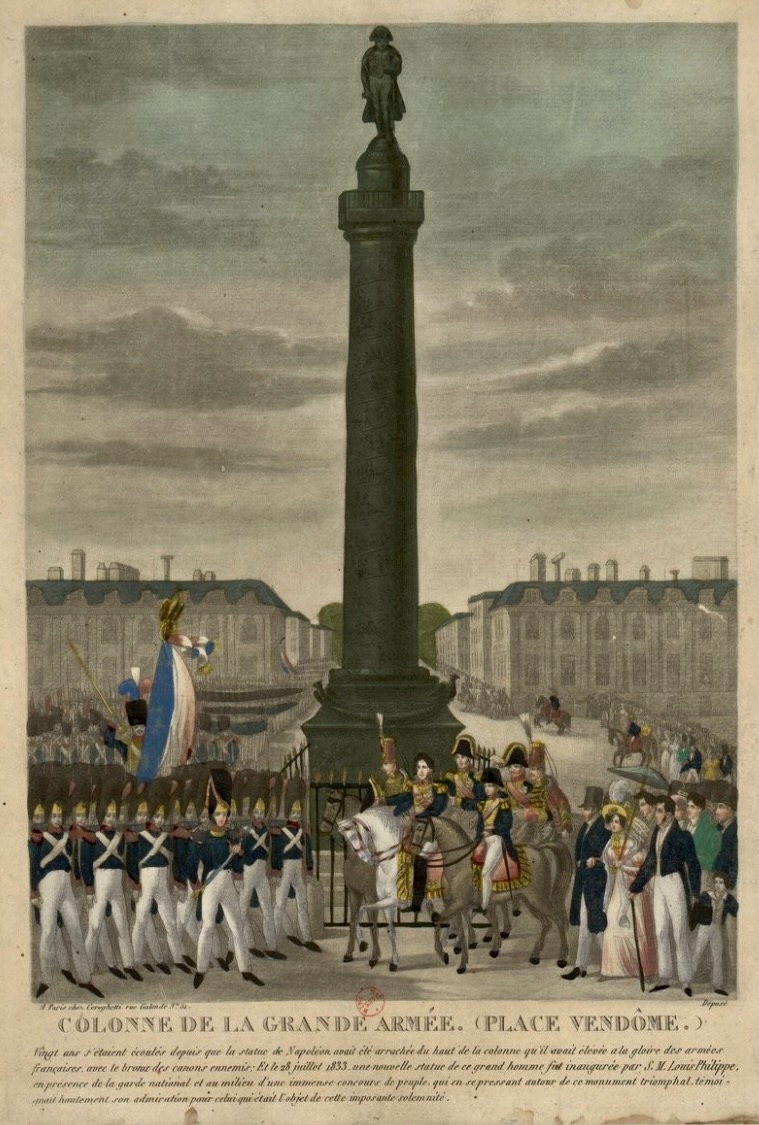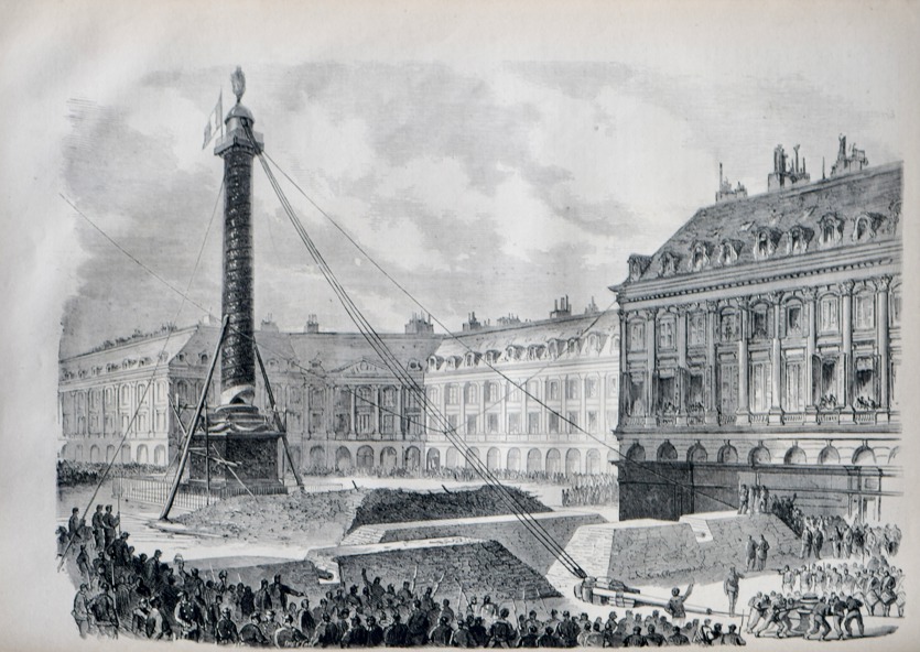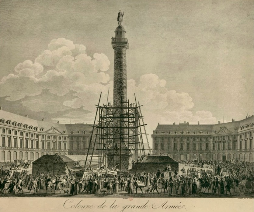 Vendôme Column with Napoleon’s statue from a period print. It may not show the exact moment of the 1810 inauguration, but it is a period depiction of the column crowned with Napoleon’s statue completed shortly after its inauguration and comes from a book of prints published around 1810.